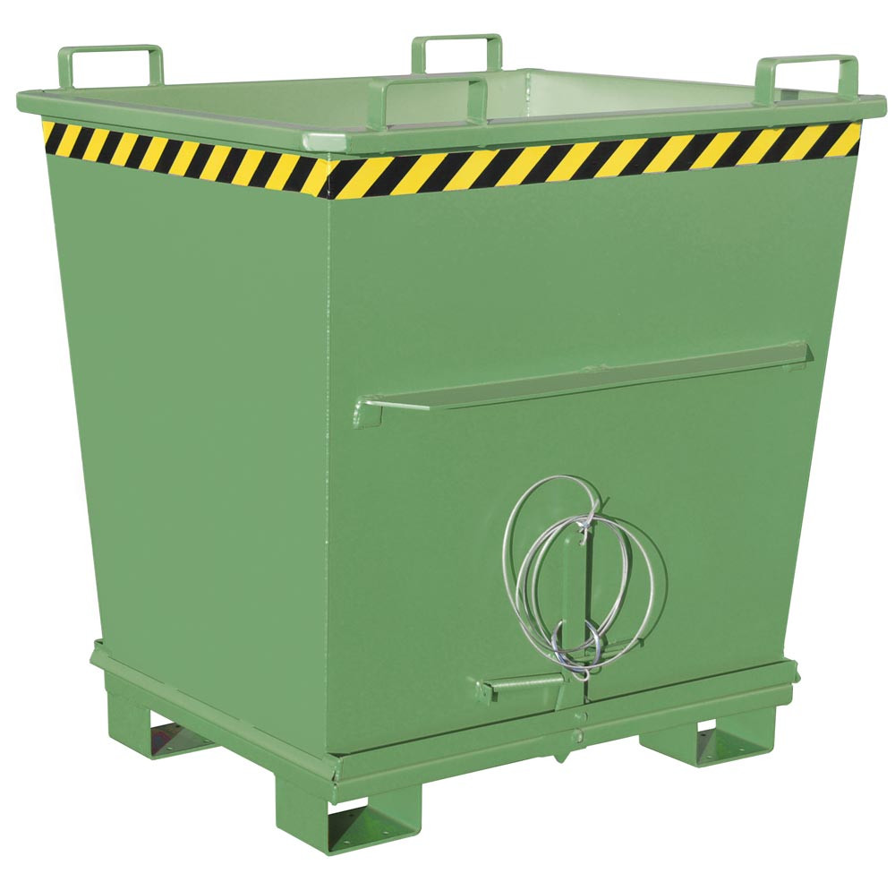 ∙ Entriegelung der Bodenklappe per Seilzug vom Stapler aus ∙ Bodenklappe schließt beim Aufsetzen selbsttätig, 90° Öffnungsbereich ∙ Sicherung für Bodenklappe gegen Abrutschen und ungewünschtes Öffnen ∙ Aufnahme für Gabelstapler und Kran sowie mit Gabelhubwagen transportierbar ∙ Robuste Stahlblechkonstruktion: Wandstärke 3 mm, Bodenklappenstärke 4 mm ∙ Einfahrbügel an der Oberseite des Behälters, Einfahrtaschen an der Unterseite · Unterfahrhöhe 100 mm