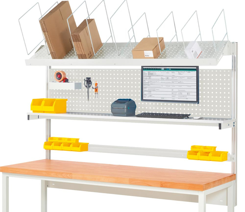 Komplettaufbau für Werkbank B 750 mm mit Etagenbord, Lochplatte H 450 mm, Montageadapter, Kartonagemagazin,Halteschiene, RAL 7035 E6490835