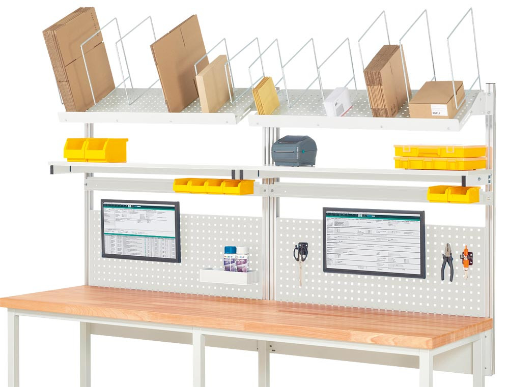 Komplettaufbau für Werkbank B 1500 mm mit Etagenbord, Lochplatte H 450 mm, Montageadapter, Kartonagemagazin,Halteschiene, RAL 7035 E6490838