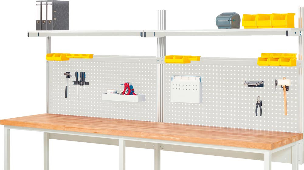 Komplettaufbau für Werkbank B 750 mm mit Etagenbord, Lochplatte H 650 mm, Halteschiene, RAL 7035 E6490821