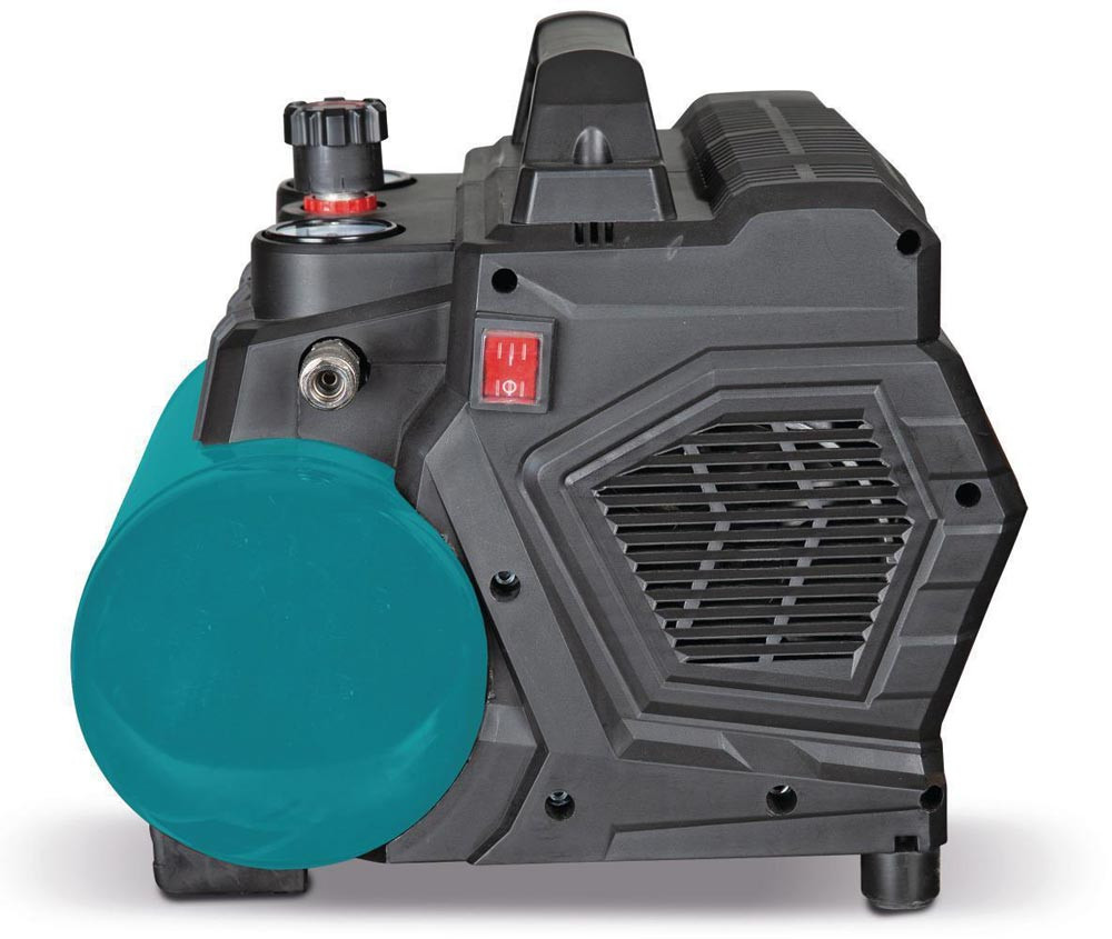 ölfrei · kompakt · sehr laufruhig · Einhand-Schnellkupplung zur Druckluftentnahme · Druckminderer für stufenlose Einstellung des gewünschten Arbeitsdrucks · je ein Manometer für die Anzeige des Behälter- und Arbeitsdrucks · Motorschutzschalter · Druckluftbehälter pulverbeschichtet