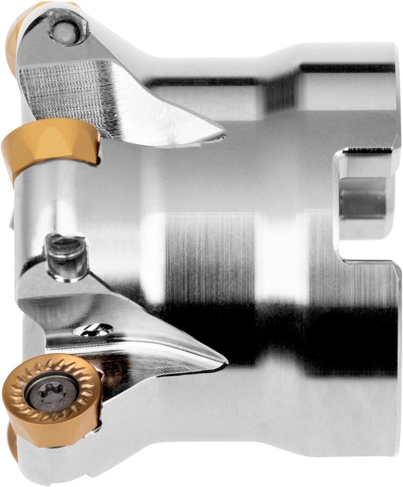 Kopier-Planfräser mit doppelt negativer Geometrie zum spannen von 5 Stück RCMT 10T3MO.. einseitigen Wendeschneidplatten · Schnittdurchmesser 50mm mit 22mm Verbindungsbohrung gemäß DIN 8030-A · 40mm Überstandslänge · Kühlkanalbohrung zum Planfräsen · Kopierfräsen · Rampen · Helikalen Fräsen und progressiven Eintauchen mit einer maximalen Schnitttiefe von 5.0mm
