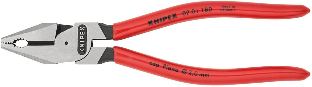 35 % Kraftersparnis gegenüber herkömmlichen Kombizangen · Greifzonen für Flach- und Rundmaterial · lange Schneiden für dickere Kabel · Schneiden zusätzlich gehärtet, Schneidenhärte ca. 63 HRC · Spezial-Werkzeugstahl in Sondergüte, geschmiedet, mehrstufig ölgehärtet