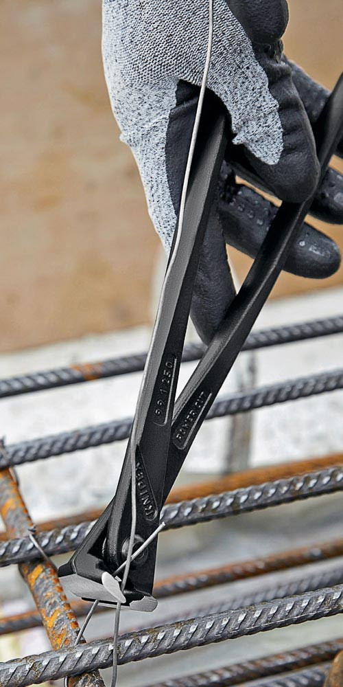 99 10 300 EAN Kraft-Monierzange 25 % Kraftersparnis im Vergleich mit herkömmlichen, gleich großen Monierzangen. auch zum Binden tiefliegender Eisen durch ihre besonders schlanke Form. Zum Fixieren von Moniereisen mit Bindedraht von der Rolle. Verdrillen und Abschneiden des Drahts in einem Arbeitsgang. Hoch übersetztes Gelenk, dadurch belastungsarmes Arbeiten auch bei Verwendung dickerer Bindedrähte. Entlastung von Sehnen und Muskulatur durch starke Dämpfung des Schnittschlags nach Durchtrennen des Bindedrahtes. Schneiden zusätzlich gehärtet, Schneidenhärte ca. 61 HRC. - Schneidwerte harter Draht (Durchmesser): Ø 2,0mm - Schneidwerte mittelharter Draht (Durchmesser): Ø 3,8mm - Schneidenlänge mm: 25,0mm 25,0mm