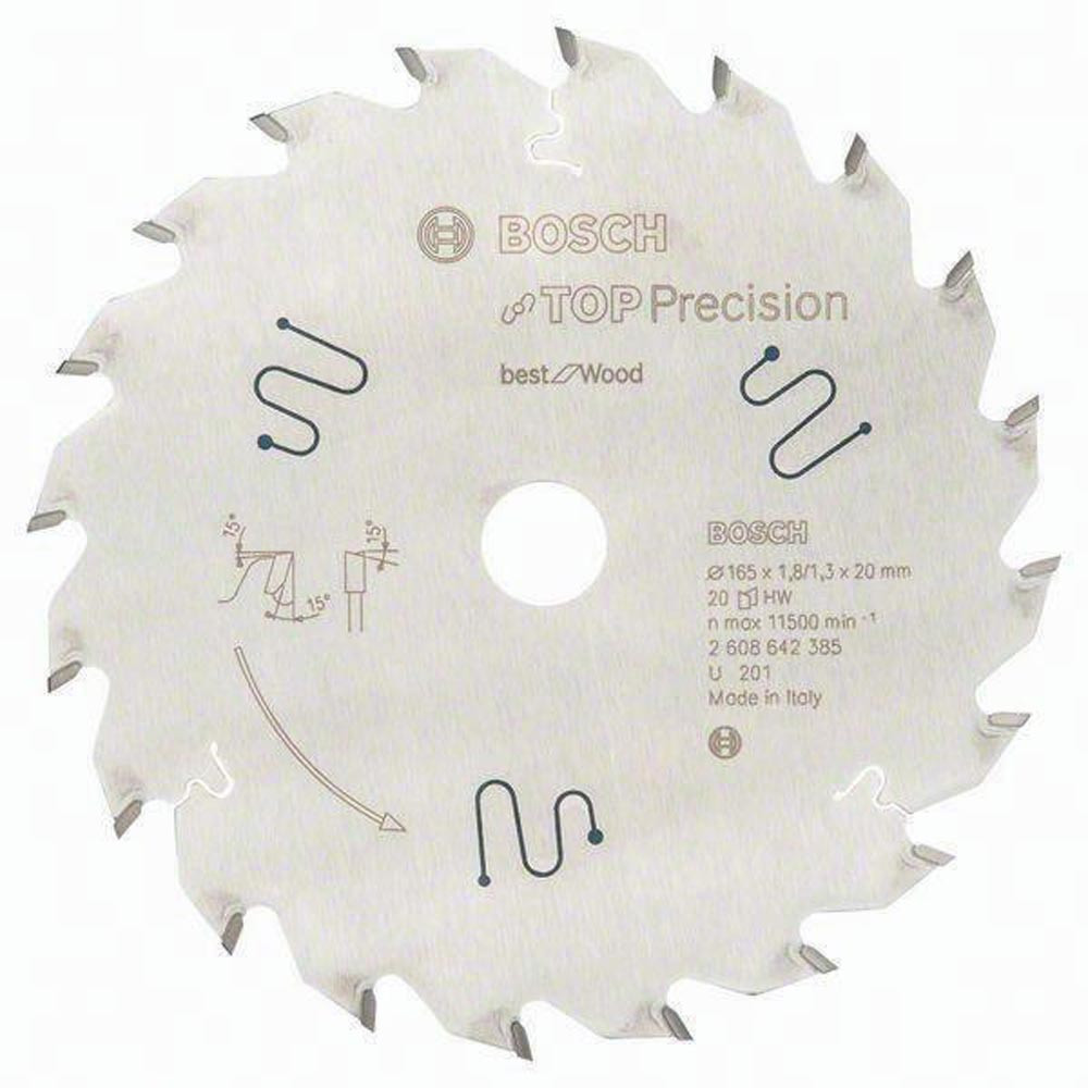 Kreissägeblatt Top Precision Best for Wood für Tauch- und Handkreissägen · Außendurchmesser: 165 mm · Bohrung: 20 mm · Schnittbreite: 1,8 mm · Zähnezahl: 32 · für präzise · saubere und leise Schnitte in allen Holzarten mit Tauch- und Handkreissägen · Zähne aus Microteq · Hartmetallzähne aus besonders dichtem Hartmetallpulver mit mikrofeiner Körnung minimieren die Abnutzung der Schneide für beste Schnittqualität und hohe Lebensdauer · Beschichtung Cleanteq: verringert das Anhaften von Rückständen (Harz · Leim) · Vibrationsminderung mit Stabilteq: Vibrationen und Geräuschentwicklung werden stark verringert · mit lasergeschnittenen Dehnungsschlitzen für hohe Blattstabilität und Genauigkeit · erstklassiger Stahl (bis HRC 46) für hohe Haltbarkeit · dank dem speziell eingerollten Spannungsring bleiben die Blätter auch im Einsatz formstabil und eben