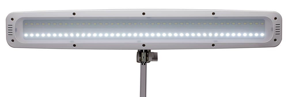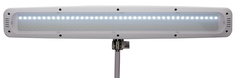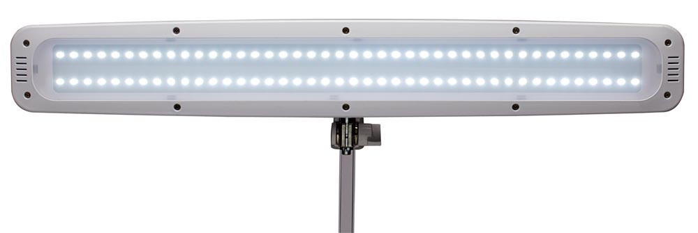 400 mm ∙ Höhe in normale Arbeitsstellung 500 mm ∙ Farbtemperatur je Lichtquelle 6500 Kelvin ∙ 3120 Lux Beleuchtungsstärke bei 35 cm Abstand, Lichtstrom je Lichtquelle 2248 Lumen ∙ Stufenlos dimmbar ∙ 3 Bereiche getrennt einschaltbar, je nach Tätigkeit oder Energieverbrauchswunsch