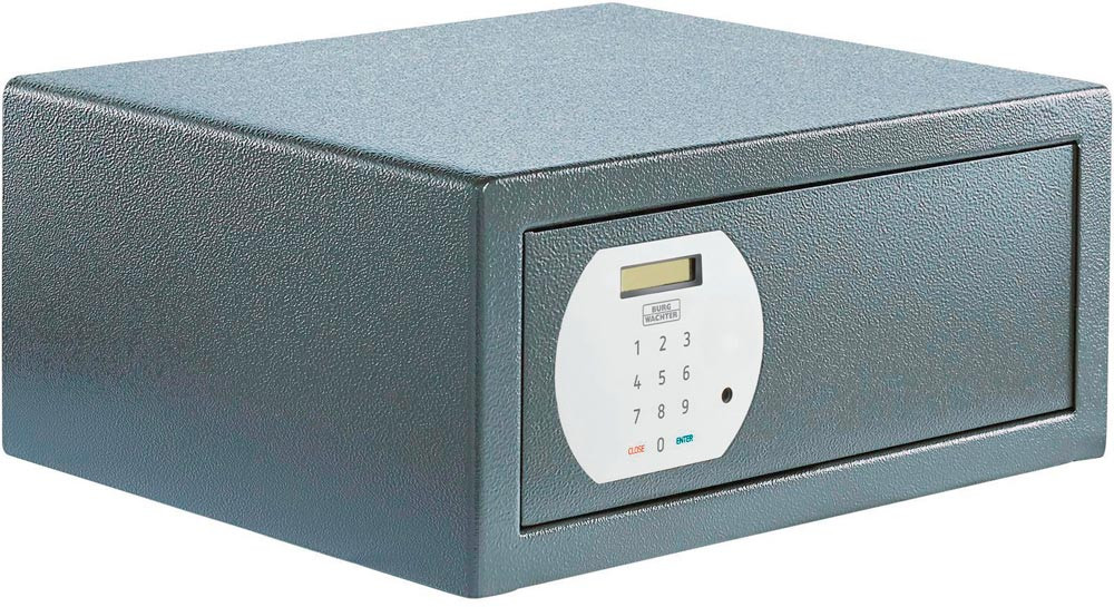 robuster einwandiger Korpus · Tür doppelwandig · verstärkte Riegelbolzen · Aufbohrschutz · für Wand- und Bodenbefestigung vorgerichtet (inkl. Befestigungsmaterial) · ideal für den Einbau in Schränke und andere Möbelstücke: Größe PS 130 mit Ordnertiefe · modernes, einfach programmierbares Elektronikschloss · Bequeme Handhabung durch motorgetriebene Verriegelung und automatische Türöffnung · verschiedene Öffnungsmethoden: Generalcode für den Hotelier · änderbarer Benutzercode für den Gast · verständliche Kurzanleitung für den Gast · haptisches Feedback bei Tastendruck · klares und gut lesbares Display · Batteriebetrieb mit 1,5 V Mignon (inklusive 4 Batterien)