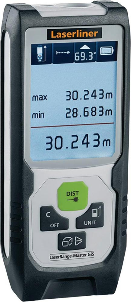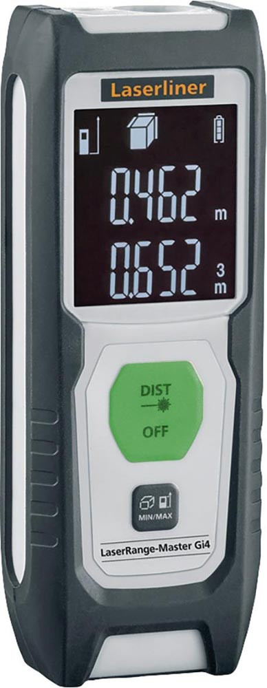 präzises Ermitteln von Längen, Flächen und Volumen · ideal für die Erfassung von Raumgrößen und das Kalkulieren von Materialmengen · grüne Lasertechnologie für hervorragende Sichtbarkeit · bei Dauermessungen zeigt das LC-Display den größten, kleinsten und den aktuellen Wert an · leicht ablesbares Display mit wählbarem Gehäusebezugspunkt · guter Schutz durch gummiertes Gehäuse · energiesparende Automatikabschaltung