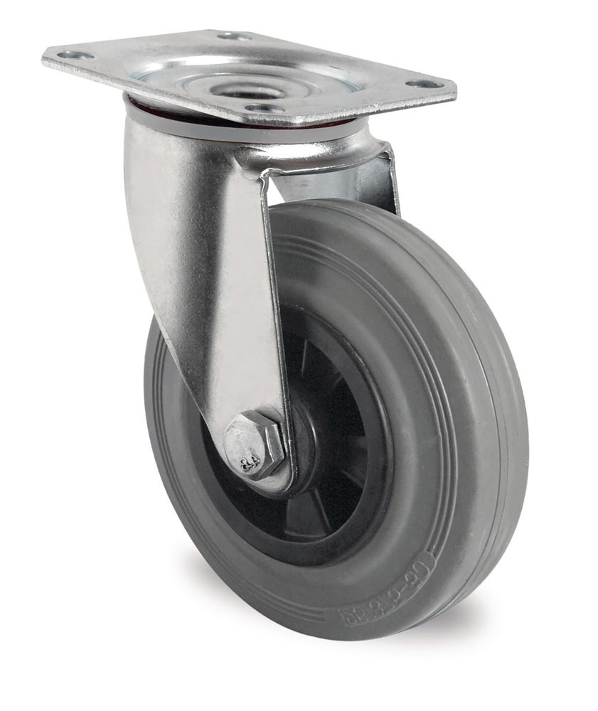 Lenkrolle Rad-Ø 200 mm Tragfähigkeit 205 kg mit Anschraubplatte Polypropylen Rollenlager Vollgummi grau