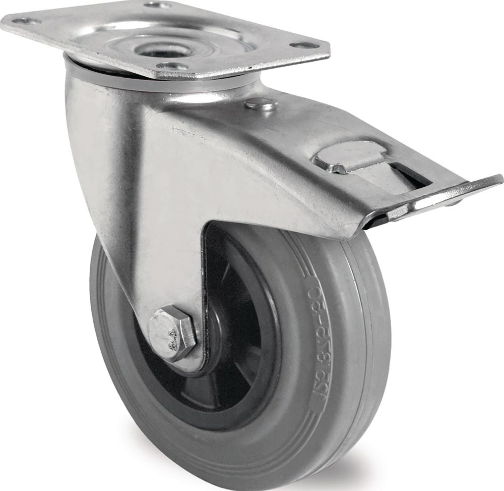 Lenkrolle mit Totalfeststeller Rad-Ø 100 mm Tragfähigkeit 75 kg mit Anschraubplatte Rollenlager Vollgummi grau