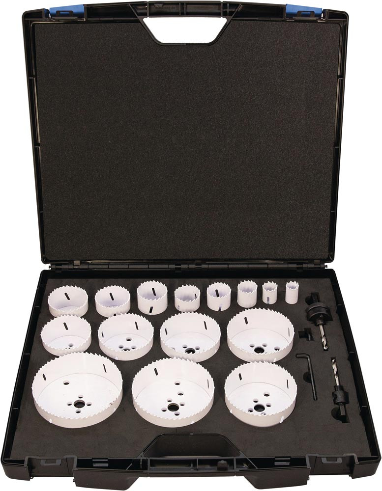 je 1 Lochsäge Ø 19, 22, 29, 35, 38, 44, 51, 57, 68, 76, 83, 92, 95, 105 und 114 mm