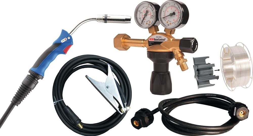 SET bestehend aus: MIG/MAG Schweißbrenner MB GRIP 36 KD 4 m, Massekabel 400A 5 m D.50 mm² KS 50, Gasschlauch 2 m, Flaschendruckminderer Argon / CO₂ 200 bar mit Ventil, Korbspulenadapter B-300