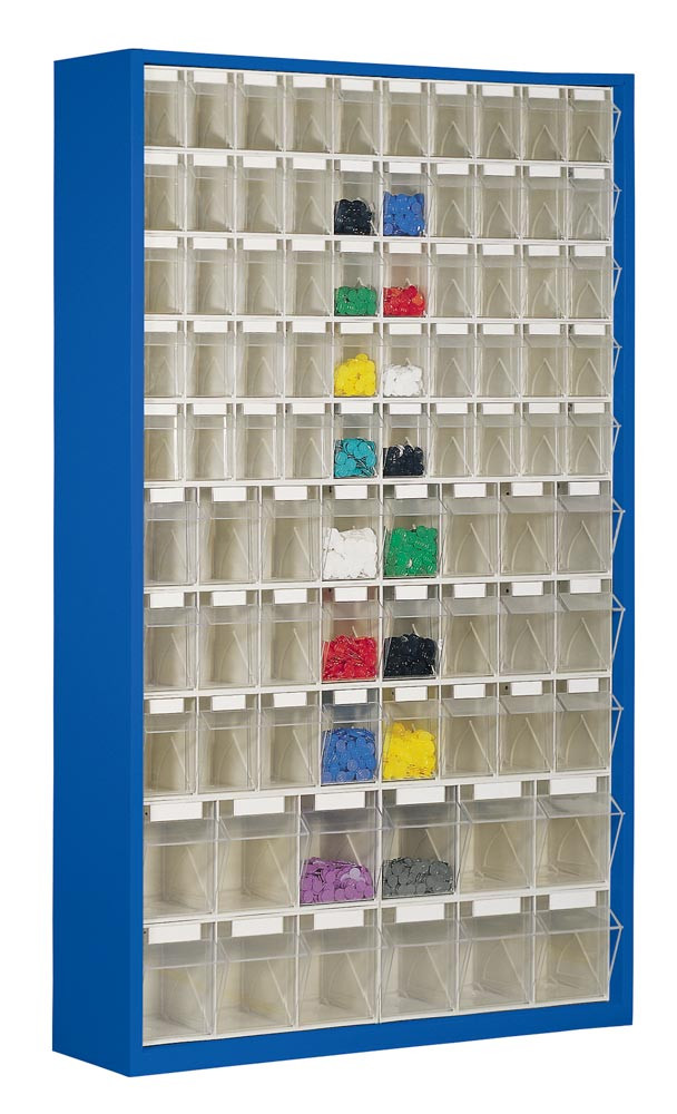 Magazinschrank, BxTxH 665x250x2000 mm, 61 Kästen, 24xGr. 6, 25xGr. 5, 12xGr. 4, Gehäusefarbe RAL 5010 enzianblau E826143