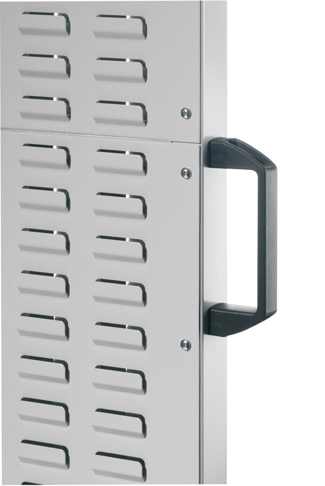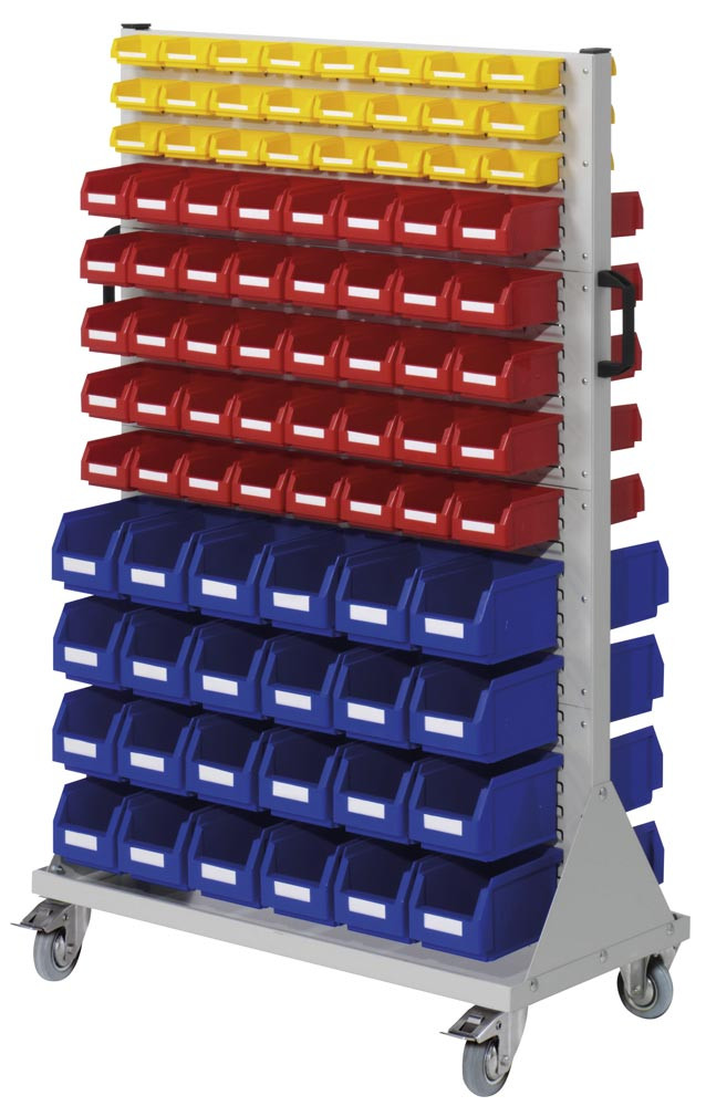 ∙ Mobile Material- und Kleinlager, beidseitig bestückt mit Schlitzplatten · Sichtlagerkästen aus Polyethylen halten Kleinteilematerial aller Art übersichtlich griffbereit und sorgen für einfachen Transport ∙ Ausführung in 3 verschiedenen Höhen ∙ Kunststoffbeschichtung in lichtgrau RAL 7035 · Mit 2 Bock- und 2 Lenkrollen Ø 100 mm, grau spurlos, davon 2 mit Feststeller gemäß EN 1757-3