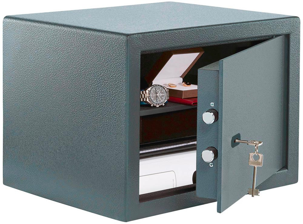 robuster einwandiger Korpus · Tür doppelwandig · Verstärkte Riegelbolzen · Aufbohrschutz · für Wand- und Bodenbefestigung vorgerichtet (inkl. Befestigungsmaterial) · ideal für den Einbau in Schränke und andere Möbelstücke