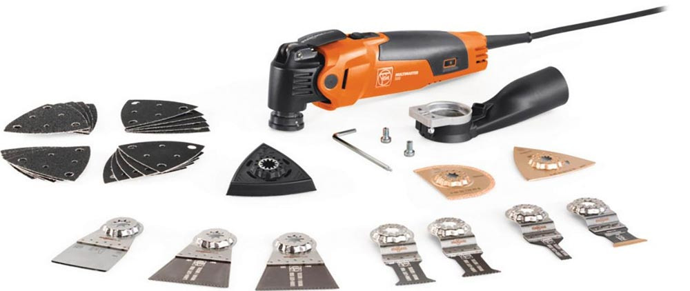 MultiTool für Ausbau und Renovierung mit über 30 Zubehören · zum Sägen in Holz und Metall, Schleifen, Fliesen austrennen und mehr · Antivibrationssystem · QuickIN-Werkzeugwechsel · Hochleistungsmotor · Tachogenerator · Metallgetriebe · mechanische Schnittstelle