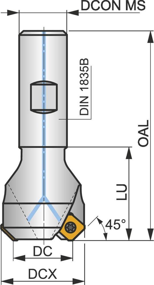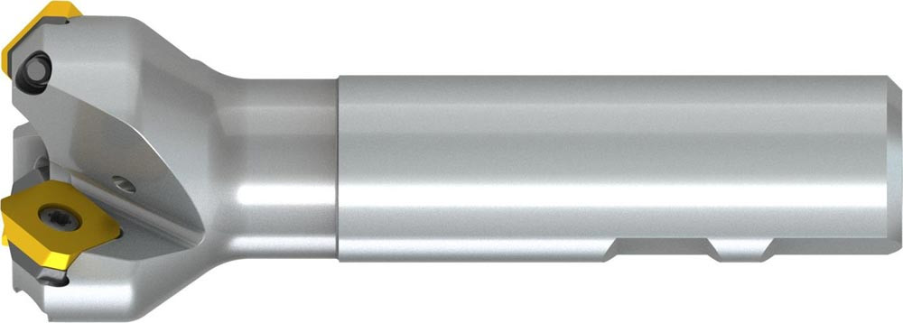 Planfräser mit positv/negativer Geometrie welche 3 aus SDET 13T3.. · SDMT 13T3.. oder XDET 13T3.. einseitige Wendeschneidplatte · Schneiddurchmesser 32mm bis maximal 44,9mm mit 45° Anfahrwinkel und 25mm Weldonschaft gemäß DIN 1835B · 45mm anwendbar und 120mm Gesamtlänge · durchgehende Kühlung zum Planfräsen und Entgraten mit einer maximalen Schnitttiefe von 6,4mm