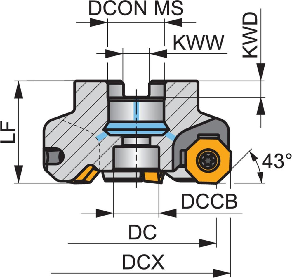 Planfräser mit doppelt negativer Geometrie welche 6 aus ONMX 0605.. · ONMX 0605..-W oder SNMX 1705.. doppelseitige Wendeschneidplatte · Schneiddurchmesser 80mm bis maximal 90,8mm mit 43° Anfahrwinkel und 27mm Bohrung gemäß DIN 8030-A · 50mm funktional und · durchgehende Kühlung und ungleicher Teilung zum Planfräsen und Entgratenmit einer maximalen Schnitttiefe von ON.. 4mm · SN.. 7mm