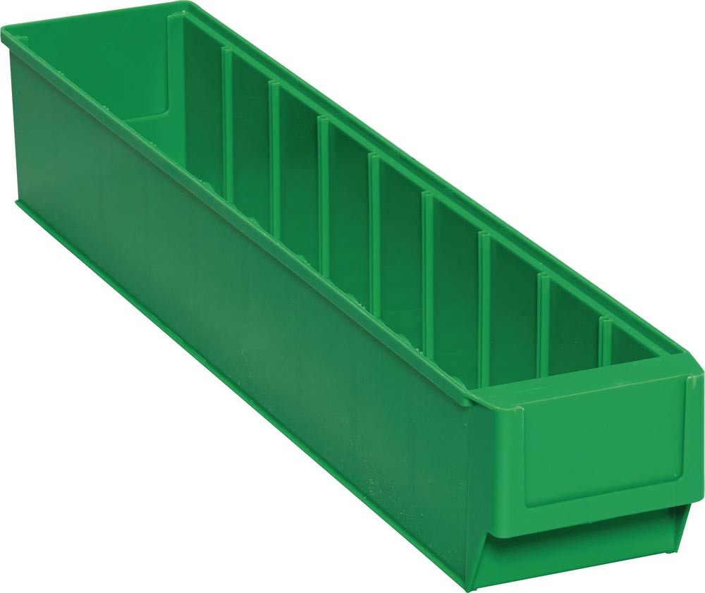 aus hochwertigem Polypropylen · grün · weitgehend beständig gegen die meisten Säuren und Öle · temperaturbeständig von -20 °C bis +80 °C · gewellter Innenboden für die leichte Entnahme von Kleinteilen · robuste Griffmulde mit großer Fläche für Beschriftungsetiketten (s. Zubehör) · variabel einsetzbar durch umsteckbare Trennwände (s. Zubehör) · die optionale Auszugssperre verhindert das Herausrutschen der Box aus dem Regal