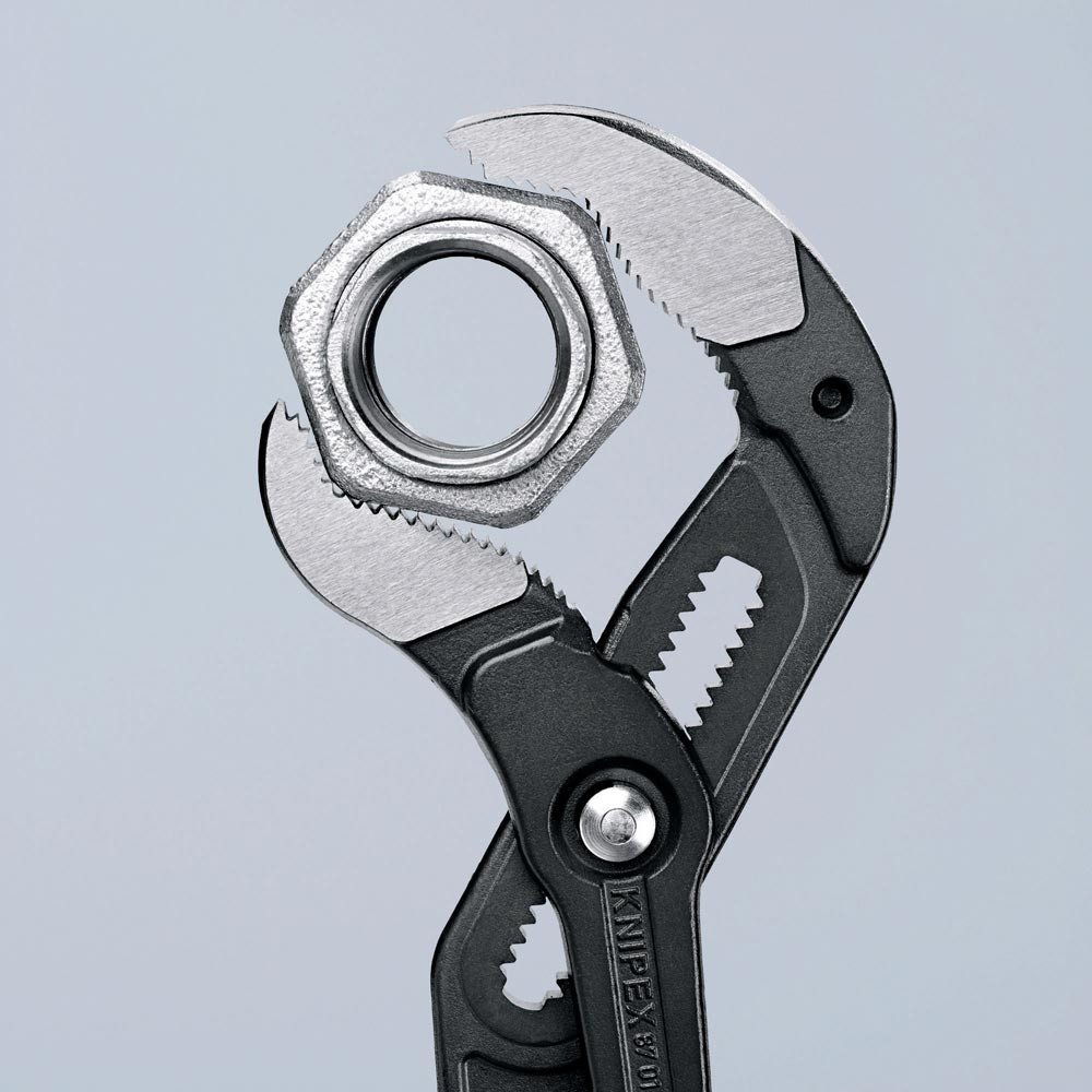 selbstklemmend an Rohren und Muttern · durchgestecktes Gelenk für hohe Stabilität durch doppelte Führung · Einstellung per Knopfdruck direkt am Werkstück · Greifflächen mit spezialgehärteten Zähnen, Härte der Zähne ca. 61 HRC · Klemmschutz · Chrom-Vanadin-Elektrostahl, geschmiedet, mehrstufig ölgehärtet