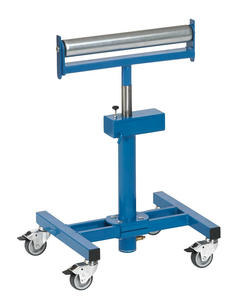 ∙ Stabile Stahlrohr-Konstruktion, pulverbeschichtet in RAL 5007 brillantblau ∙ Auflagerolle aus Stahlrohr Ø 60 mm, kugelgelagert ∙ Höhenverstellbar, drehbar und arretierbar ∙ Mit pneumatischer Absenkdämpfung ∙ Beidseitig Schwerkraft-Anschläge 20 mm über Oberkante Rolle - drehen sich bei breiten Werkstücken selbsttätig weg ∙ Mit 4 feststellbaren Lenkrollen, TPE-Bereifung 75 x 25 mm ∙ Die Lieferung erfolgt zerlegt - einfache Selbstmontage!