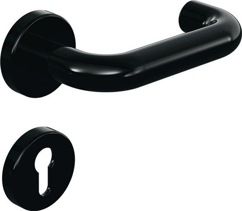 Türdrücker in U-Form aus Polyamid mit durchgehendem Stahlkern bis in das Drückerende, durchgängig eingefärbt, Durchmesser 20 mm, mit Ansatzführung und Rastnut, Montage durch einfaches Einrasten der Türdrücker in die auf der Tür vormontierten Unterteile.