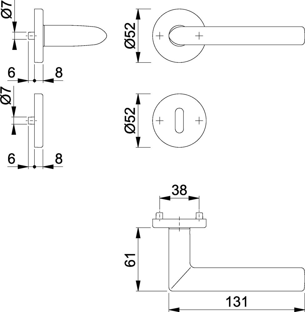 Innentür-Rosetten-Garnitur geprüft nach DIN EN 1906 (Gebrauchs-Kategorie Klasse 3) · Türgriffe mit Schnellstift-Verbindung (mit 8 mm Vollstift) für Türstärke 37-42 mm und Rückholfeder · Rosetten mit Stütznocken unsichtbar verschraubt · Drückerlänge bei Aluminium 132 mm, bei Edelstahl 131 mm · Anschlagrichtung DIN links / rechts