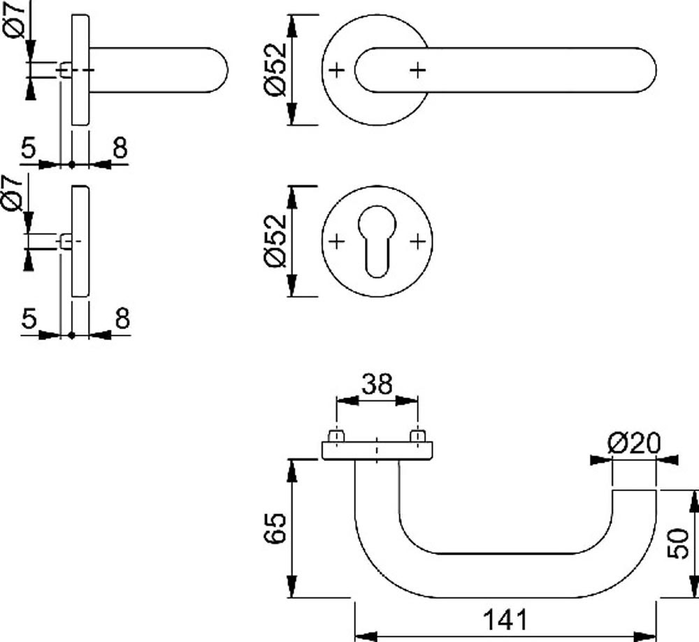 für Kombischutz · Edelstahl-Rosetten-Türgriff-Halbgarnitur mit Schlüsselrosette für Außen-/Wohnungsabschluss-Türen (Innenseite) · Lagerung: Türgriff lose, wartungsfreies Gleitlager · Verbindung: Schnellstift mit Vollstift (separat bestellen) · Unterkonstruktion: Stahl, Stütznocken · Befestigung: verdeckt, durchgehend, für Gewindeschrauben M5 · Besonderheit: kombinierbar mit Knopflangschild ES1 (SK2) für Kombi-Schutz · DIN links / rechts