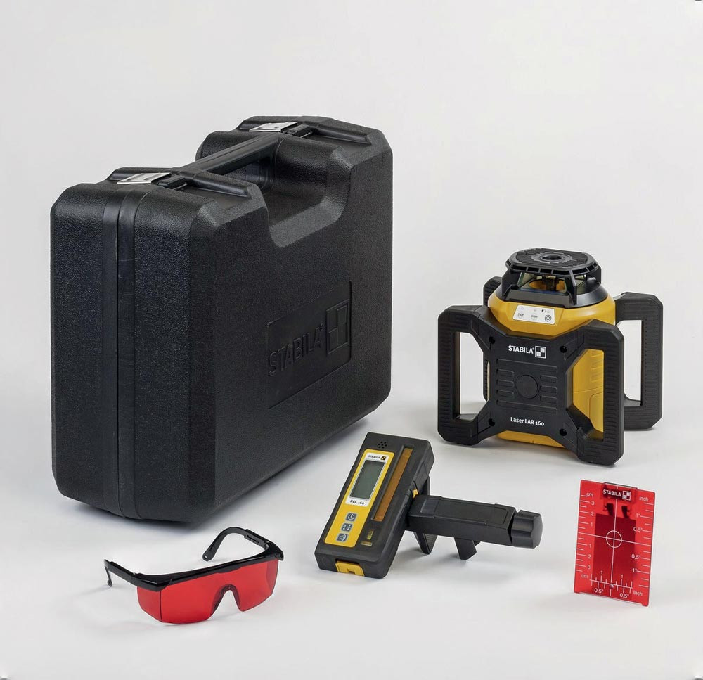 vollautomatischer Rotationslaser für horizontalen und vertikalen Einsatz · hohe Nivelliergenauigkeit ± 0,1 mm/m · staub- und wasserdicht · stoßabsorbierender STABILA Softgrip-Mantel schützt vor Schlägen · einfache Bedienung über drei Bedienknöpfe · Arbeitsbereich mit Set-Receiver bis zu 600 m Durchmesser · Betriebsdauer 15 h · Einsatzgebiete: Trockenbau, Fensterbau, Fliesenarbeiten, Montagearebiten sowie Elektroinstallationsarbeiten · Stativaufnahme 1/4 ″