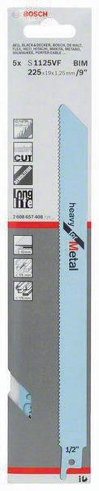 Säbelsägeblatt S 1125 VF Heavy for Metal. Werkstoff: BIM. Zahnausführung: Varioverzahnt. Einsatzbereiche: Für mittelstarke bis starke Bleche (von 2 bis 10 mm Stärke) · für dünnwandige und dickwandige Rohre und Profile (kleiner als 175 mm Stärke). Ideal für Abbrucharbeiten in Metall. Müheloser · feiner Schnitt. Inhalt der Verkaufsverpackung: 5 Stück.