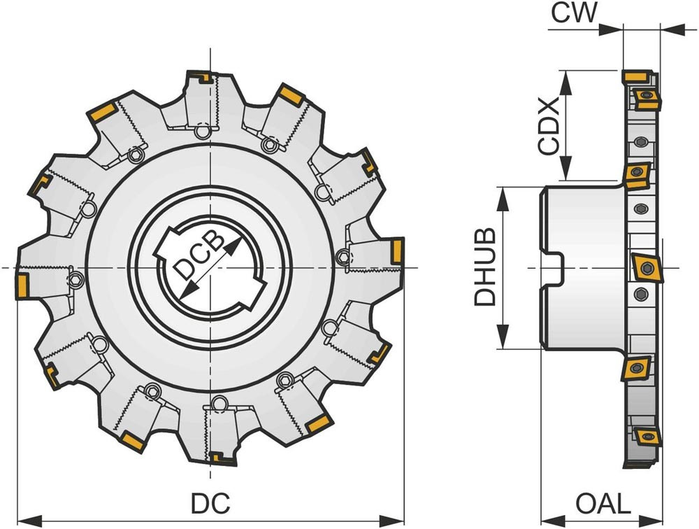 Scheibenfräser mit positiver/negativer Geometrie zum spannen von 8 Stück CNHQ 1005.. doppelseitigen Wendeschneidplatten · Schnittdurchmesser 125mm mit 90° Anstellwinkel und 40mm Verbindungsbohrung gemäß DIN 8030-B · 50mm Überstandslänge zum tiefen Nutfräsen mit einer schnittbreite von 14,0 ÷ 18,5mm