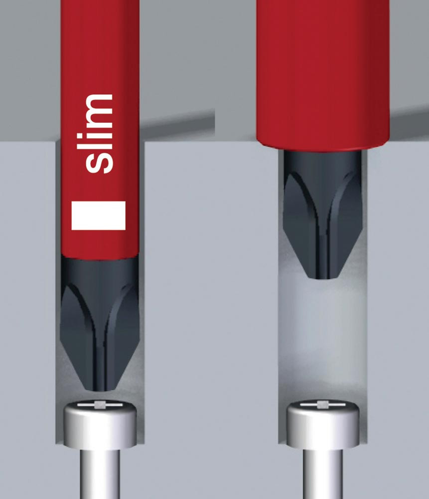 Durch die im vorderen Bereich vollständig in die Klinge integrierte Schutzisolation können auch tiefliegende Schrauben gut erreicht werden