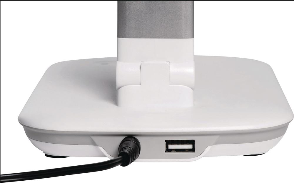Aluminium · mit Standfuß · mit integriertem 5V, max. 500 mA USB Typ A Anschluss zum Aufladen von z. B. Smartphones · 5-Stufen-Dimmer mit Touchfeld-Bedienung am Leuchtenfuß · Leuchtenkopf 260 x 50 mm – Armlänge 365 mm – Höhe 425 mm ∙ Betriebsspannung 220 - 240 V · Lichtfarbe 4.000 Kelvin - neutralweiß · Lebensdauer 20.000 Stunden · Lichtstrom 716 Lumen · gewichteter Energieverbrauch 6 kWh/1000 h · Energieeffizienzklasse E (Spektrum A bis G)