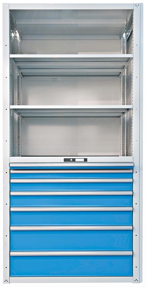 Schubladenregal, Grundfeld, 3 Universal-, 2 Verstellböden, 7 Schubladen, BxTxH 1117x706x2200 mm, RAL 7035/5012 E836308