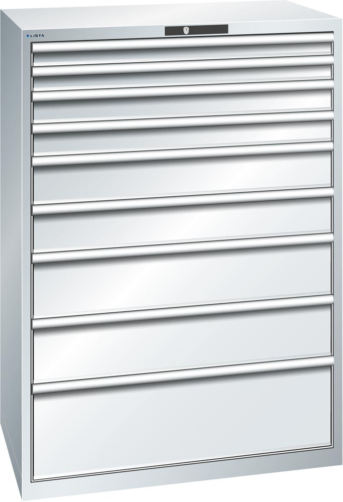 Schubladenschrank, Traglast/Schubl.: 75 kg, 9 Schubl.: 2x75, 2x100, 2x150, 2x200, 1x300 mm, Zylinderschloss, BxTxH 1023x725x1450 mm, RAL 5012 E1615147