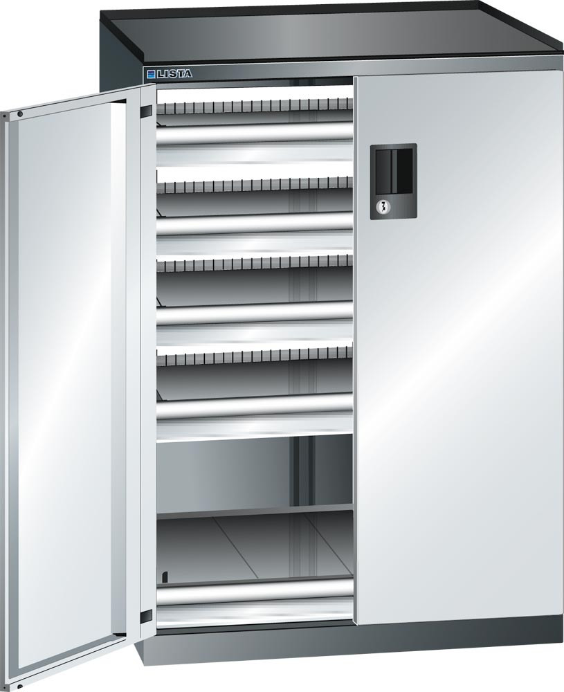 Schubladenschrank m. Flügeltüren, BxTxH 717x600x1020 mm, 5x75 Schubladen 200 kg, Schloss, RAL 7035 E1986720