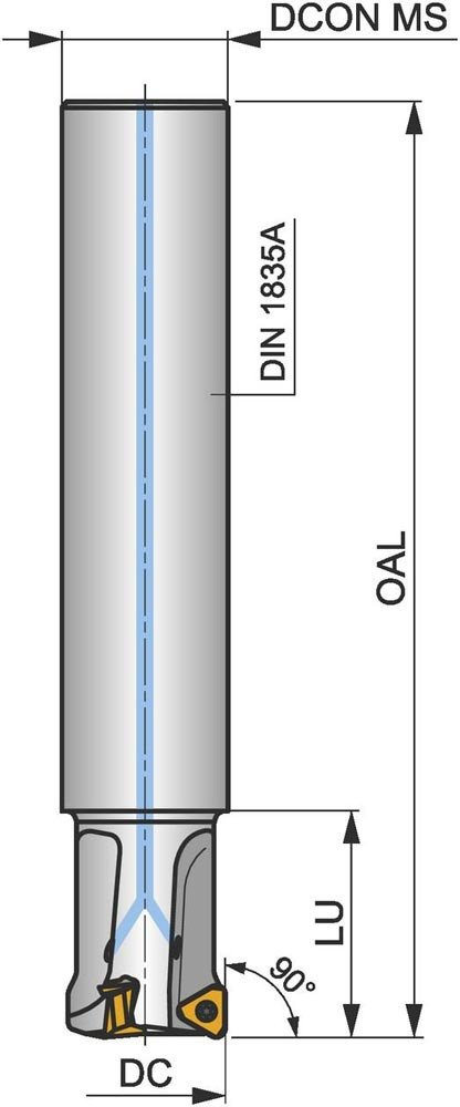 Plan-Eckfräser mit doppelt negativer Geometrie zum spannen von 3 Stück TNGX 1004.. doppelseitigen Wendeschneidplatten · Schnittdurchmesser 22mm mit 90° Anstellwinkel und 25mm Zylinderschaft gemäß DIN 1835A · 50mm Funktionslänge 180mm Gesamtlänge · Kühlkanalbohrung zum Planfräsen · flachen Schulterfräsen und flachen Nutfräsen mit einer maximalen Schnitttiefe von 5.0mm