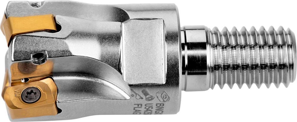 Hochvorschubfräser mit positiver/negativer Geometrie zum spannen von 5 Stück BNGX 10T3.. oder ANHX 10T3.. Wendeschneidplatten · Schnittdurchmesser 25mm mit 20° Anstellwinkel und M12 Gewindeschaft für modulare Standardhalter · 33mm Überstandslänge · Kühlkanalbohrung zum Planfräsen · Kopierfräsen · flachen Schulterfräsen · Rampen · Helikalen Fräsen · Tauchfräsen und progressiven Eintauchen mit einer maximalen Schnitttiefe von 1.0mm