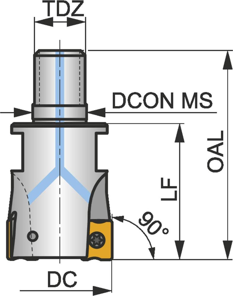 Eckfräser mit doppelt negativer Geometrie zum spannen von 2 Stück LNGX 1205.. oder LNGU 1205.. doppelseitigen Wendeschneidplatten · Schnittdurchmesser 32mm mit 90° Anstellwinkel und M16 Gewindeschaft für modulare Standardhalter · 43mm Überstandslänge · Kühlkanalbohrung zum flachen Schulterfräsen · flachen Nutfräsen und Tauchfräsen mit einer maximalen Schnitttiefe von 9.0mm