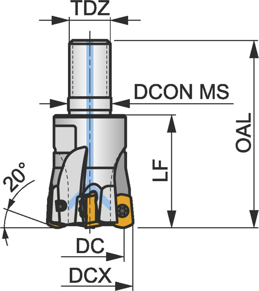Hochvorschubfräser mit positiver/negativer Geometrie zum spannen von 5 Stück BNGX 10T3.. oder ANHX 10T3.. Wendeschneidplatten · Schnittdurchmesser 32mm mit 20° Anstellwinkel und M16 Gewindeschaft für modulare Standardhalter · 40mm Überstandslänge · Kühlkanalbohrung und ungleiche Teilung zum Planfräsen · Kopierfräsen · flachen Schulterfräsen · Rampen · Helikalen Fräsen · Tauchfräsen und progressiven Eintauchen mit einer maximalen Schnitttiefe von 1.0mm