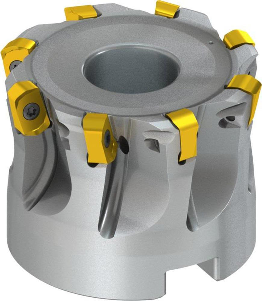 Hochvorschubsfräser mit doppelt negativer Geometrie welche 8 aus BNGX 10T3.. Wendeschneidplatte · Schneiddurchmesser 47mm bis maximal 52mm mit 29° Anfahrwinkel und 22mm Bohrung gemäß DIN 8030-A · 40mm funktional und · durchgehende Kühlung und ungleicher Teilung zum Planfräsen · flachen Schulterfräsen · Tauchfräsen · Kopierfräsen · Rampen · progressiven Tauchfräsen und helikalen Fräsen mit einer maximalen Schnitttiefe von 1mm