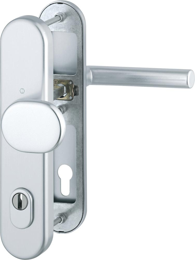für Abschlusstüren · einbruchhemmend nach DIN 18257 · Stahl-Unterkonstruktion im Außen- und Innenschild · mit Rückholfeder-Paket · mit Zylinderabdeckung aus gehärtetem Stahl für vorstehende Zylinderlänge 10-18 mm · innen: loser Türgriff, mit Schnellstift-Verbindung · hochfeste, verdeckte Verschraubung · Knopfschild-Randhöhe: 15 mm · Lochung PZ · DIN links / rechts · einschließlich Befestigungsmaterial · Widerstandsklasse ES 1