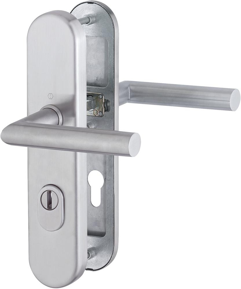 für Abschlusstüren · einbruchhemmend nach DIN 18257 · Stahl-Unterkonstruktion im Außen- und Innenschild · mit Rückholfeder-Paket · mit Zylinderabdeckung aus gehärtetem Stahl für vorstehende Zylinderlänge 10-18 mm · innen: loser Türgriff · mit Schnellstift-Verbindung · hochfeste, verdeckte Verschraubung · Knopfschild-Randhöhe: 15 mm · Lochung PZ · DIN links / rechts · einschließlich Befestigungsmaterial · Widerstandsklasse ES 1