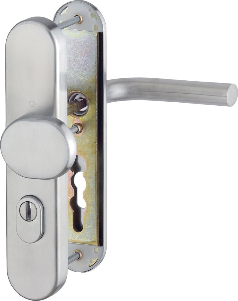 für Abschlusstüren · einbruchhemmend nach DIN 18257 · Stahl-Unterkonstruktion im Außen- und Innenschild · mit Rückholfeder-Paket · mit Zylinderabdeckung aus gehärtetem Stahl für vorstehende Zylinderlänge 10-18 mm · innen: loser Türgriff · mit Schnellstift-Verbindung · hochfeste, verdeckte Verschraubung · Knopfschild-Randhöhe: 15 mm · Lochung PZ · DIN links / rechts · einschließlich Befestigungsmaterial · Widerstandsklasse ES 1