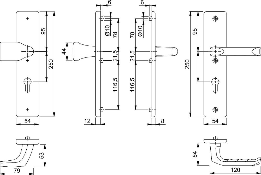 für Abschlusstüren · Zamak-Unterkonstruktion im Außen- und Innenschild · mit feststehendem Knopf · FDW-Profilstift-Verbindung · sichtbare Verschraubung · Lochung PZ · Außenschild-Randhöhe 12 mm · Randhöhe Schild: 12 mm · DIN links / rechts · Widerstandsklasse ES 0