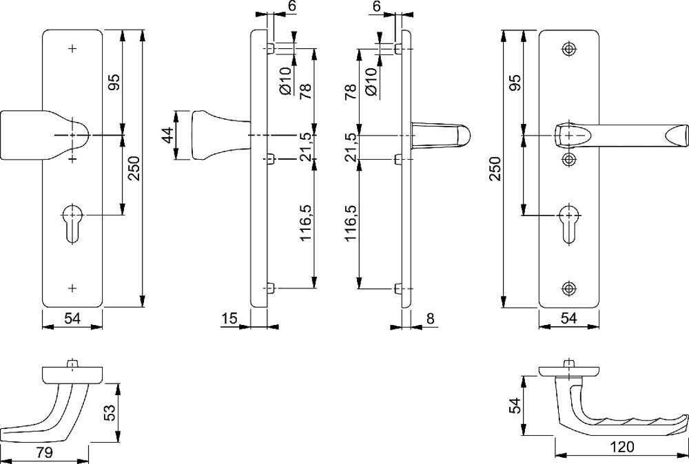 für Abschlusstüren · Zamak-Unterkonstruktion im Außen- und Innenschild · mit feststehendem Knopf · FDW-Profilstift-Verbindung · sichtbare Verschraubung · Lochung PZ · Außenschild-Randhöhe 12 mm · Randhöhe Schild: 15 mm · Widerstandsklasse ES 0