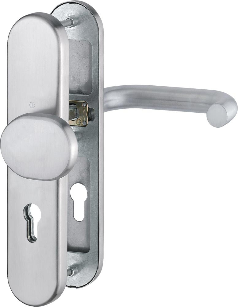 für Abschlusstüren · einbruchhemmend nach DIN 18257 · Stahl-Unterkonstruktion im Außen- und Innenschild · mit Rückholfeder-Paket · mit Schnellstift-Verbindung · hochfeste, verdeckte Verschraubung · Knopfschild-Randhöhe: 12 mm · Lochung PZ · DIN links und rechts verwendbar · einschließlich Befestigungsmaterial · Widerstandsklasse ES 1