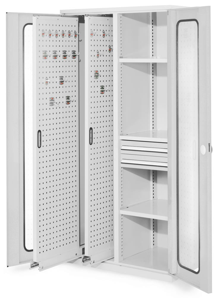 Schwerlastschrank, Sichtfenstertüren, 2 Vertikalauszüge, 3 Fachböden, 2 Schubl. BxTxH 1000x600x1950 mm, RAL 7035 E863645