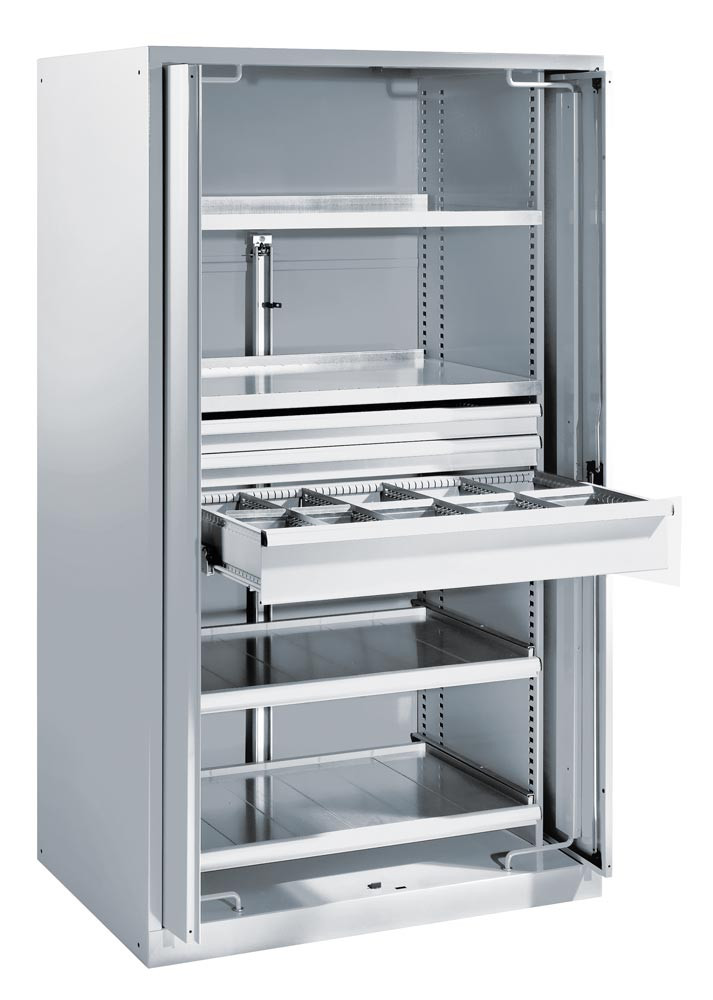 · Hohe Gehäusestabilität durch verschweißte Stahlblechkonstruktion · Eignen sich zur Lagerung von schweren Materialien, Vorrichtungen, Maschinen und Maschinenteilen · 4 Frontvarianten wählbar · Dank Rasterung individuell erweiterbar mit Böden, Schubladen mit Patentrasterung und Auszugböden · Gehäusetragfähigkeit 1500 kg · Traglast: Schubladen 200 kg, Fachböden 160 kg · Schlossvarianten frei wählbar: Klappgriff mit Zylinderschloss und 2 Schlüsseln oder elektronisches Zahlenschloss
