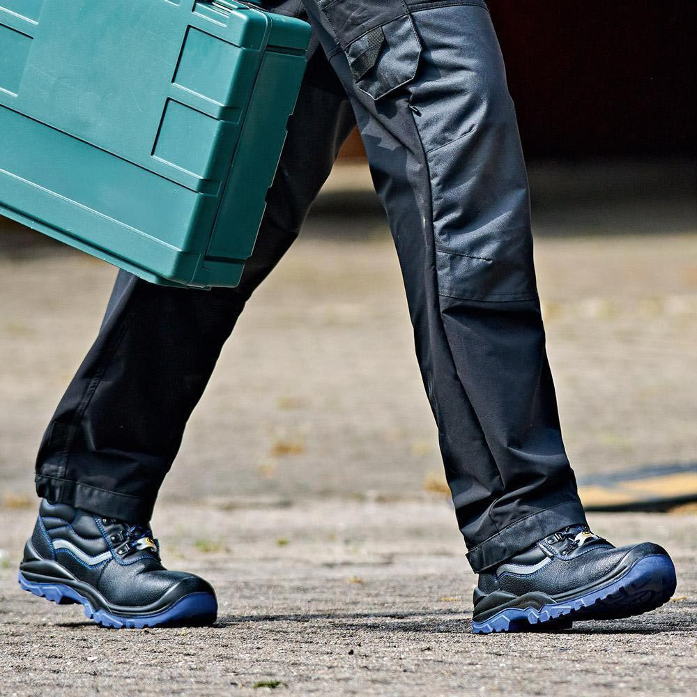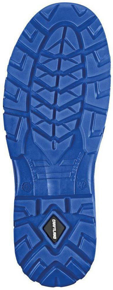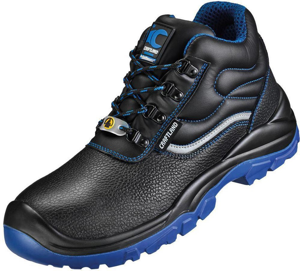 nach EN ISO 20345 · S3 FO SR ESD · Schaft aus leicht geprägtem Leder · ergonomisch gepolsterter Kragen · gepolsterte Staublasche · Verschluss durch Triangels und Rundsenkel · blaues atmungsaktives 3D-Innenfutter · herausnehmbare, antistatische High-Poly Einlegesohle · Reflexstreifen auf beiden Seiten · korrosionsfreie Stahlkappe und duchtrittsichere Stahlzwischensohle · antistatische, öl- und säurebeständige, rutschhemmende 2-Schichten-PU-Sohle · blaue Laufsohle · nicht kreidend · integrierte Überkappe · Schuhweite: 10,5 · Einsatzbereich: Bauwirtschaft, Handwerk, Industrie, etc.